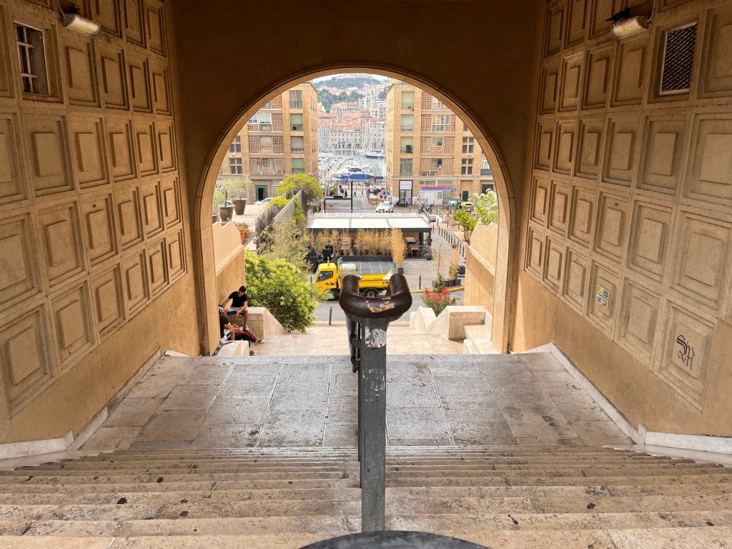 Marseille, France is a gritty port town with a few interesting walking spots and the Notre Dame de la Garde, which sits atop a hill and has a 360 degree view of the city.