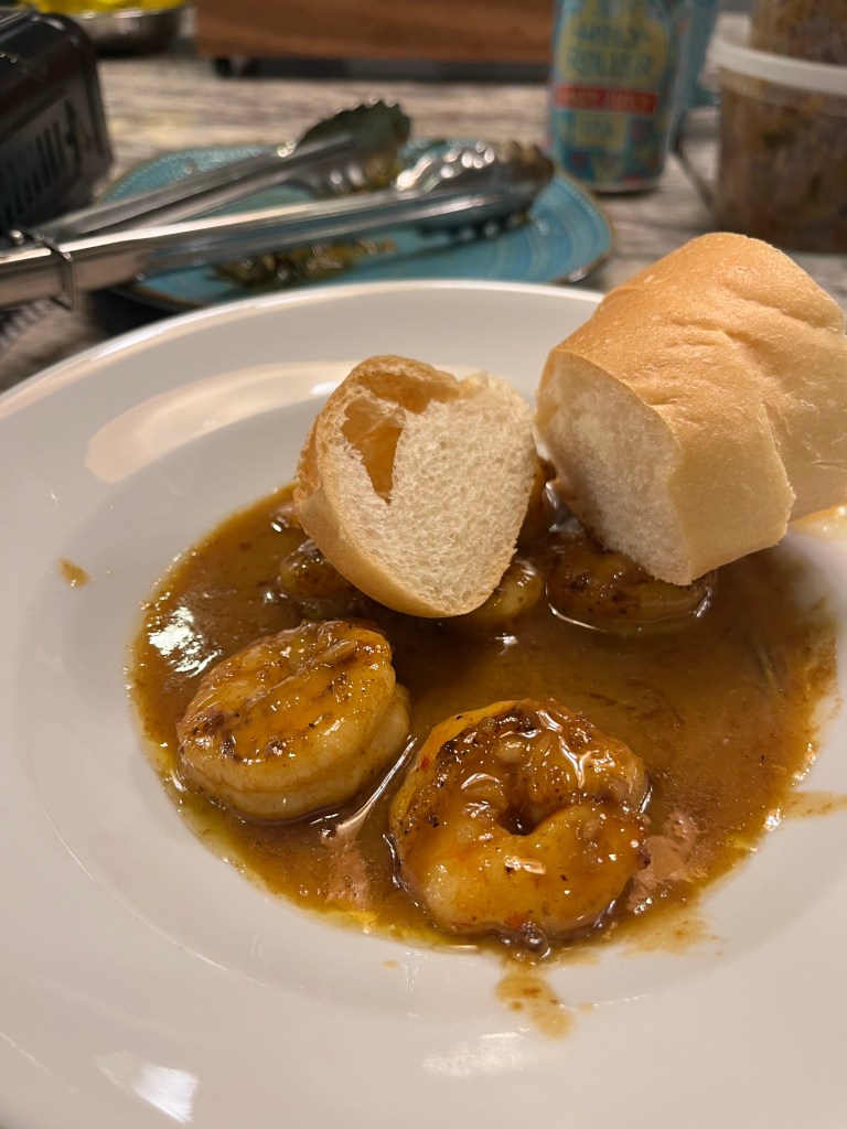 We made chocolate bread pudding, andouille sausage and taso ham jambalaya, and barbeque shrimp in a butter sauce.