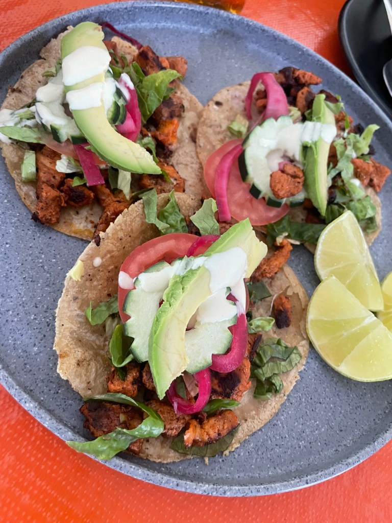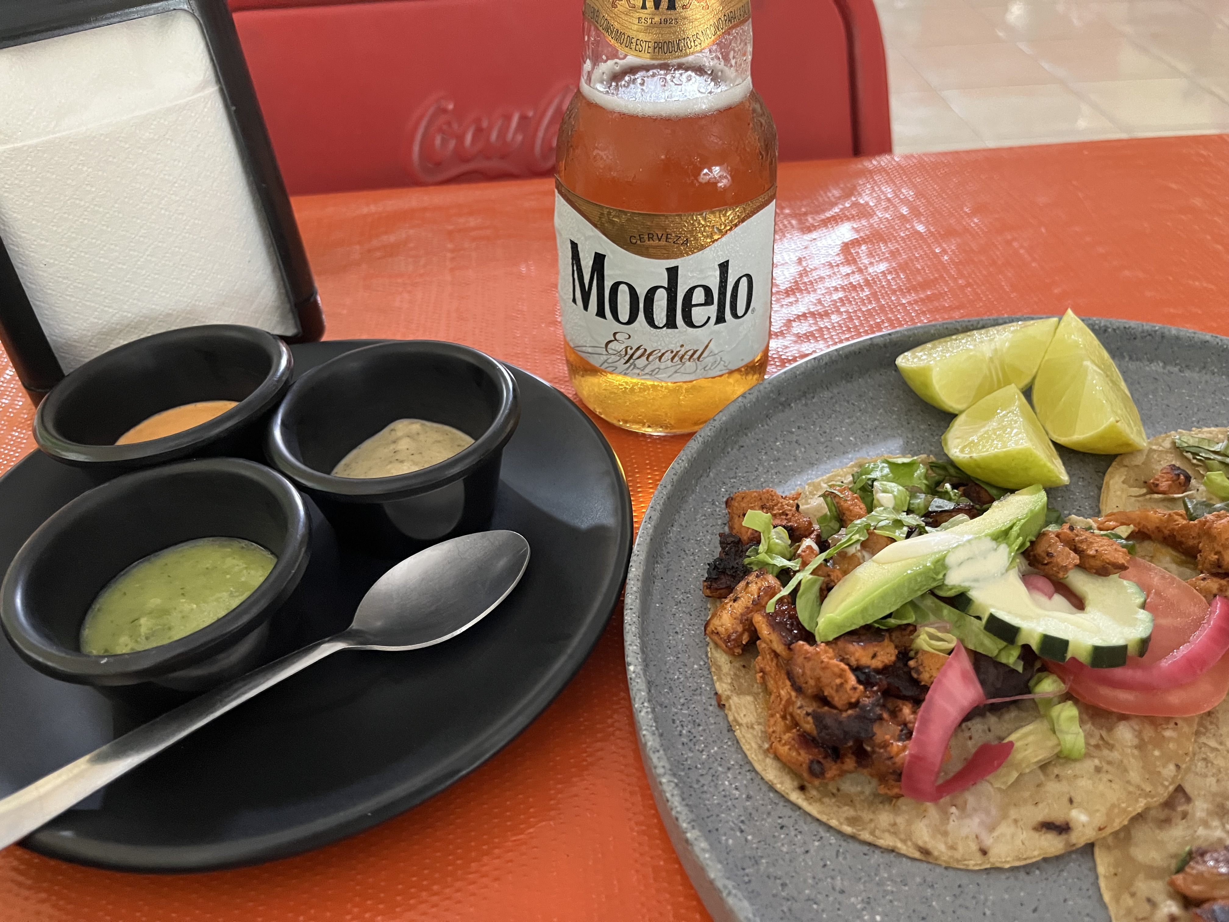 We got a dish of 3 tacos 85pesos/16 and a Modelo for a total bill of $9 us.