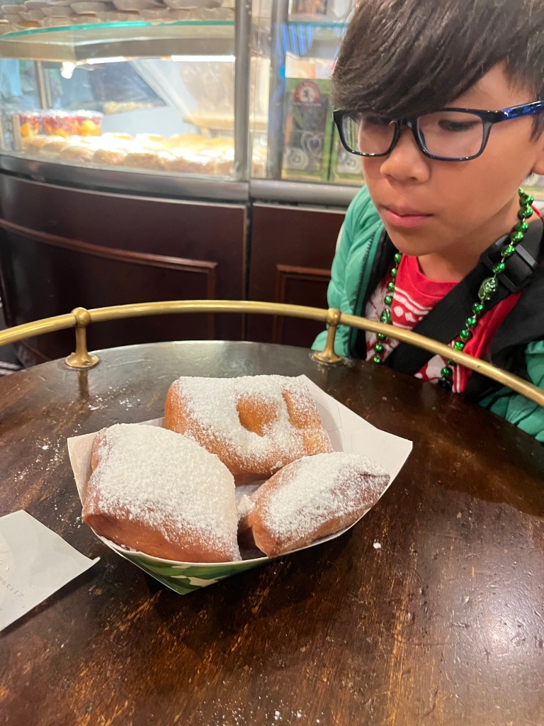 Above is Hudson with a serving of beignet-hot, doughy and super messy powdered sugar.