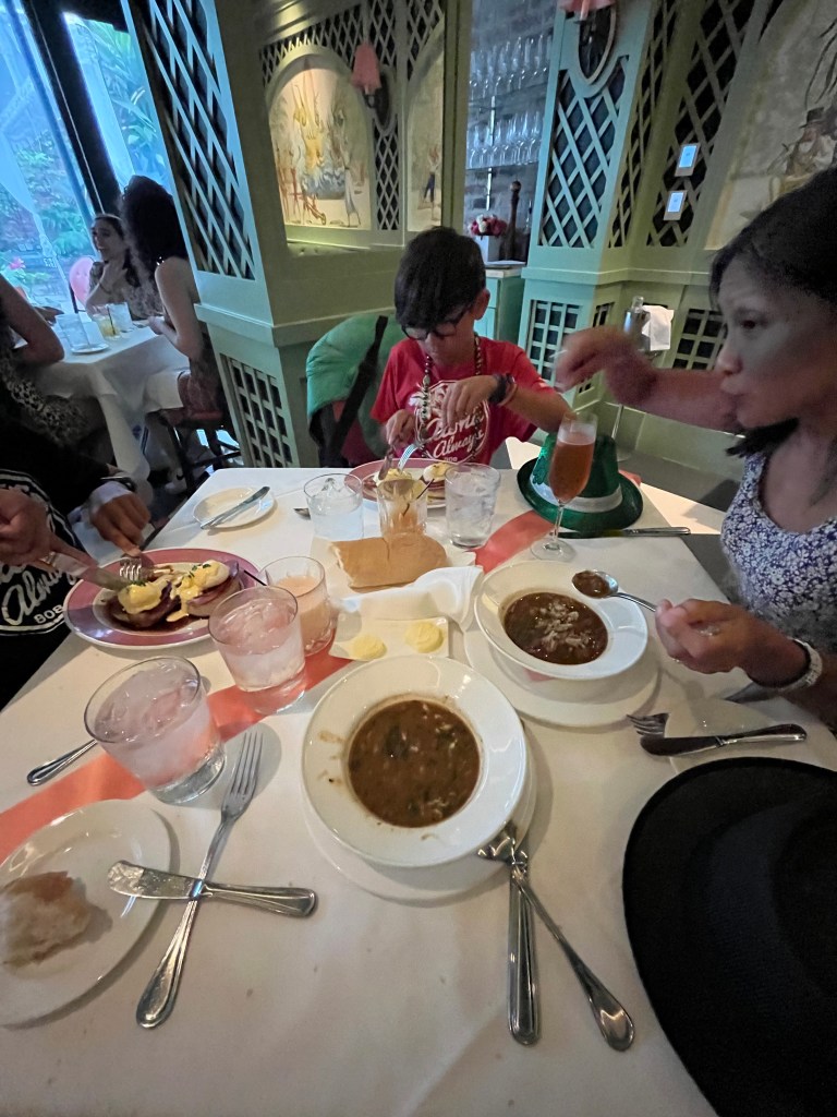 We tried turtle soup with sherry, seafood jambalaya and eggs Benedict.