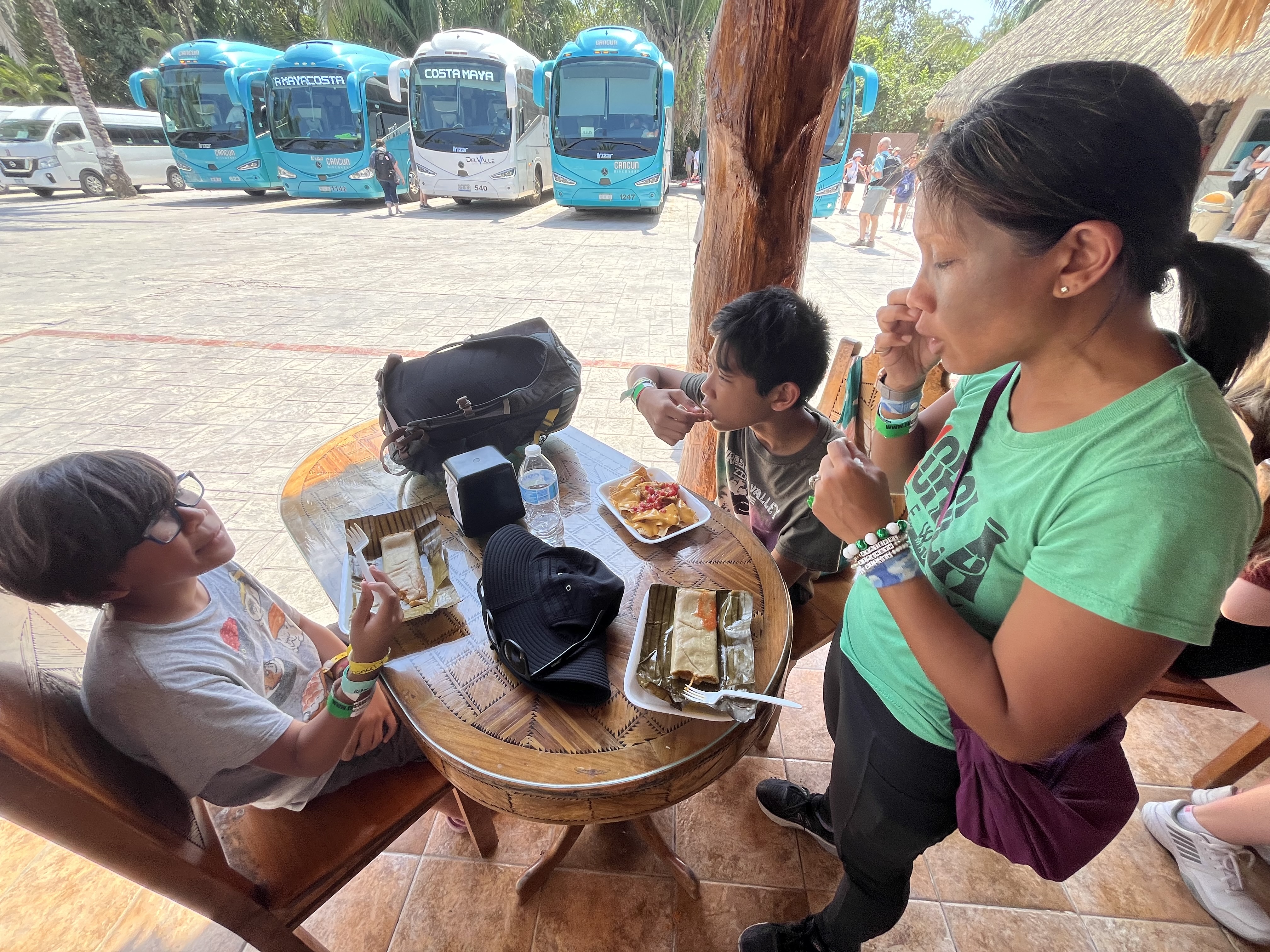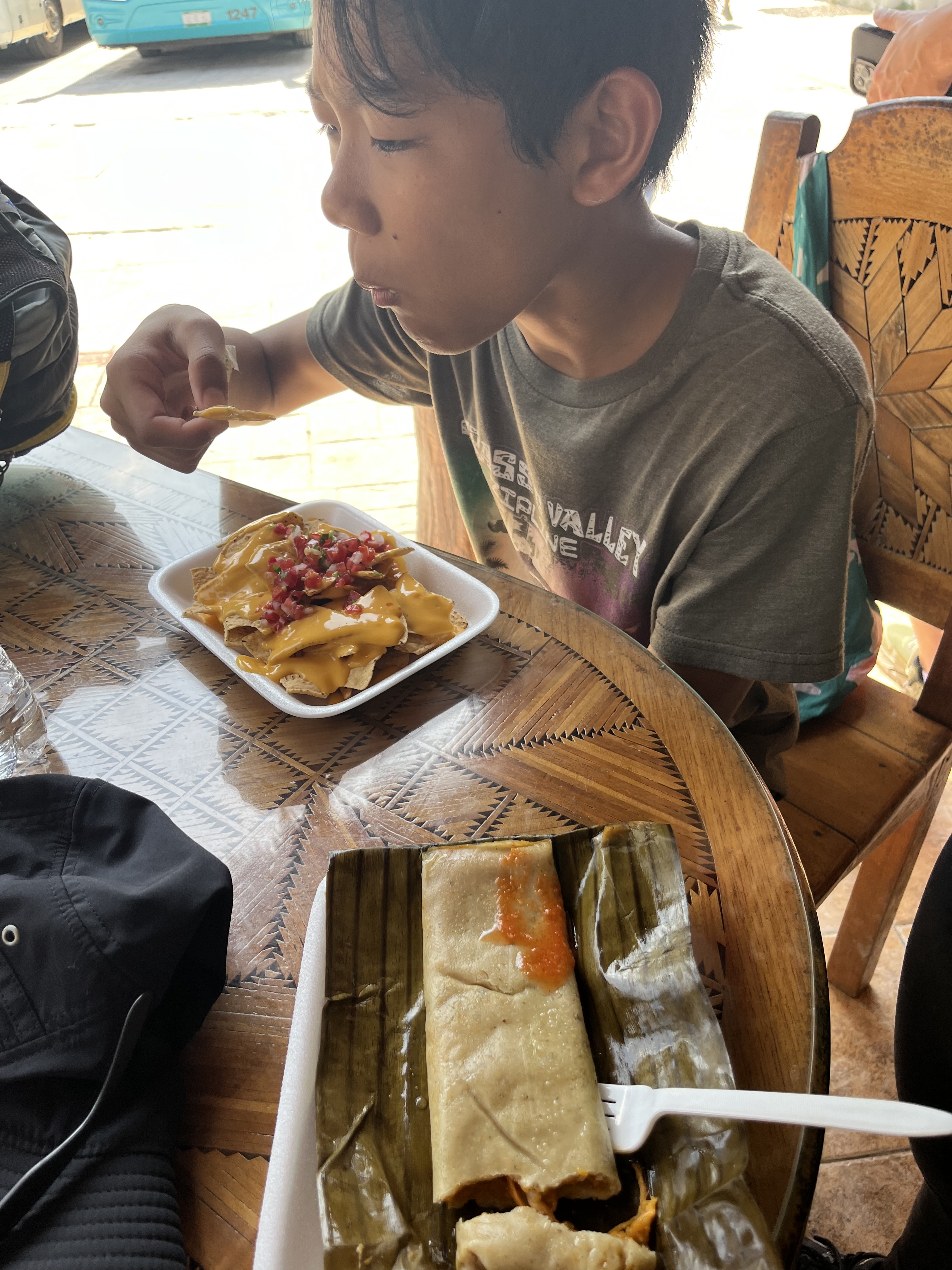 Back at the entrance we ate Mayan delicacies of nachos and xx? lol. Hudson bought a stone cat and I decided against getting a die whistle.